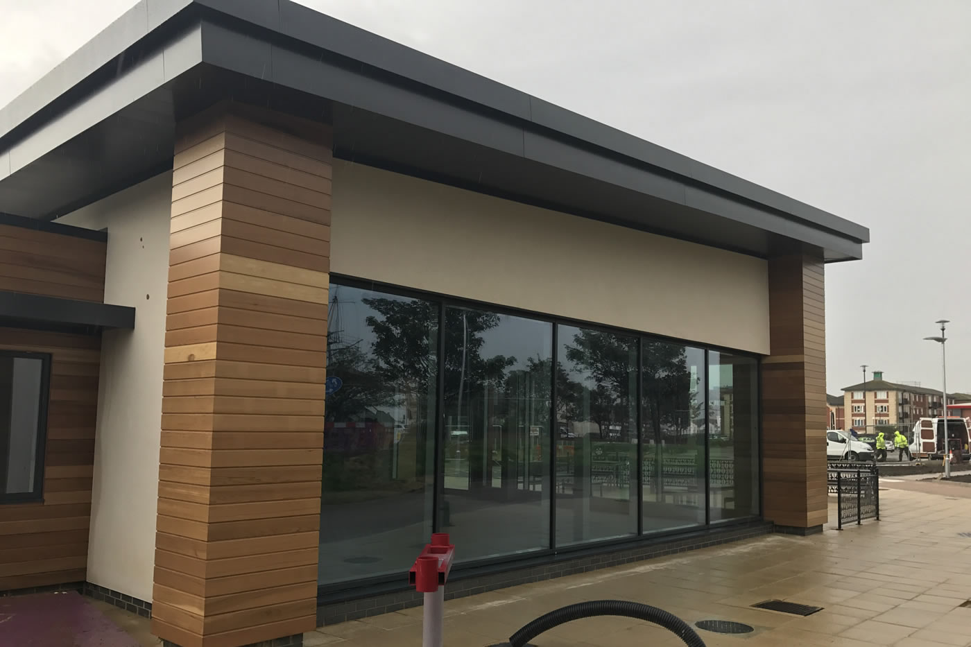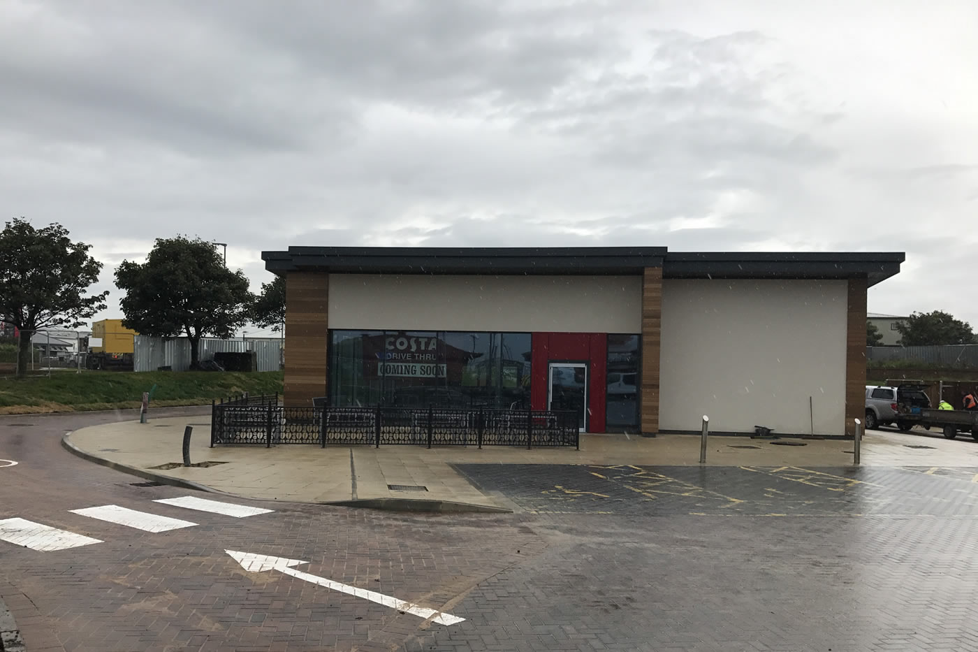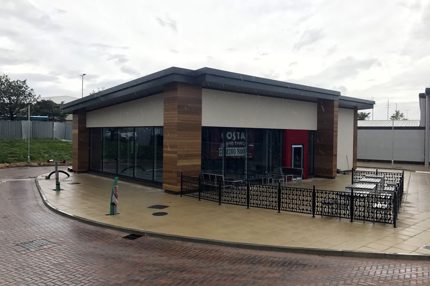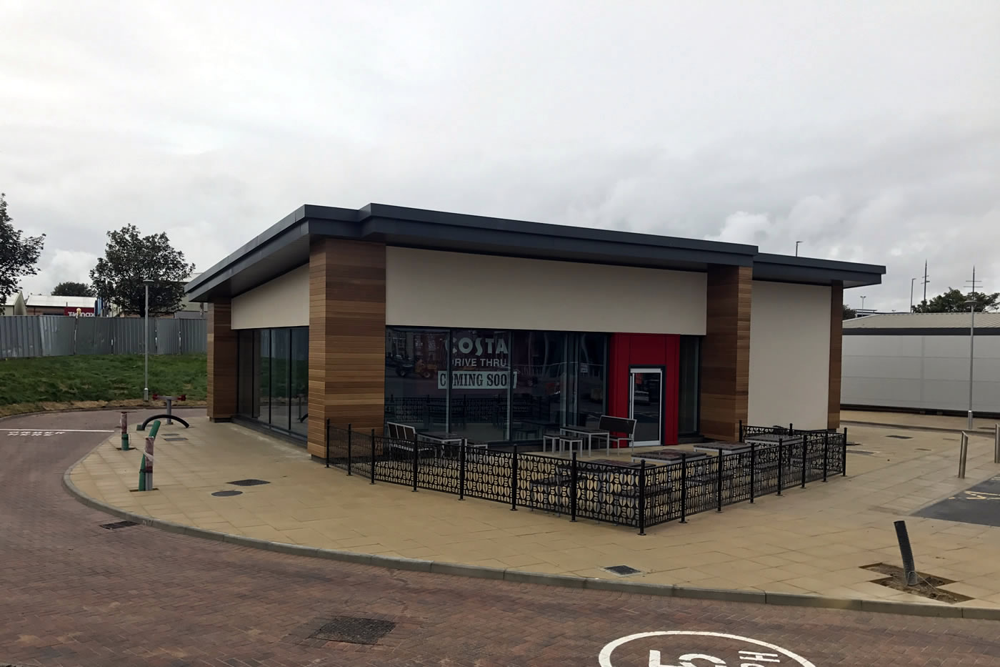Design and construction of Costa Coffee Drive-Thru building to Shell including site strip of the existing surface to reduced levels, piled foundations, ground beams, suspended beam and block floor, external works including hardstanding area, Drive-Thru route, line marking, soft landscaping, external refuse storage areas, external lighting and associated services and drainage, connection to associated mains service supplies. Steel frame, masonry works, build up cladding roof system and gutters, single ply roofing to servery, through colour render, cedar cladding, aluminium windows and doors, steel fire exit door.