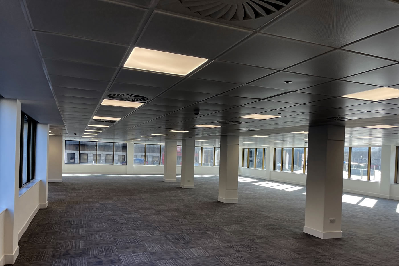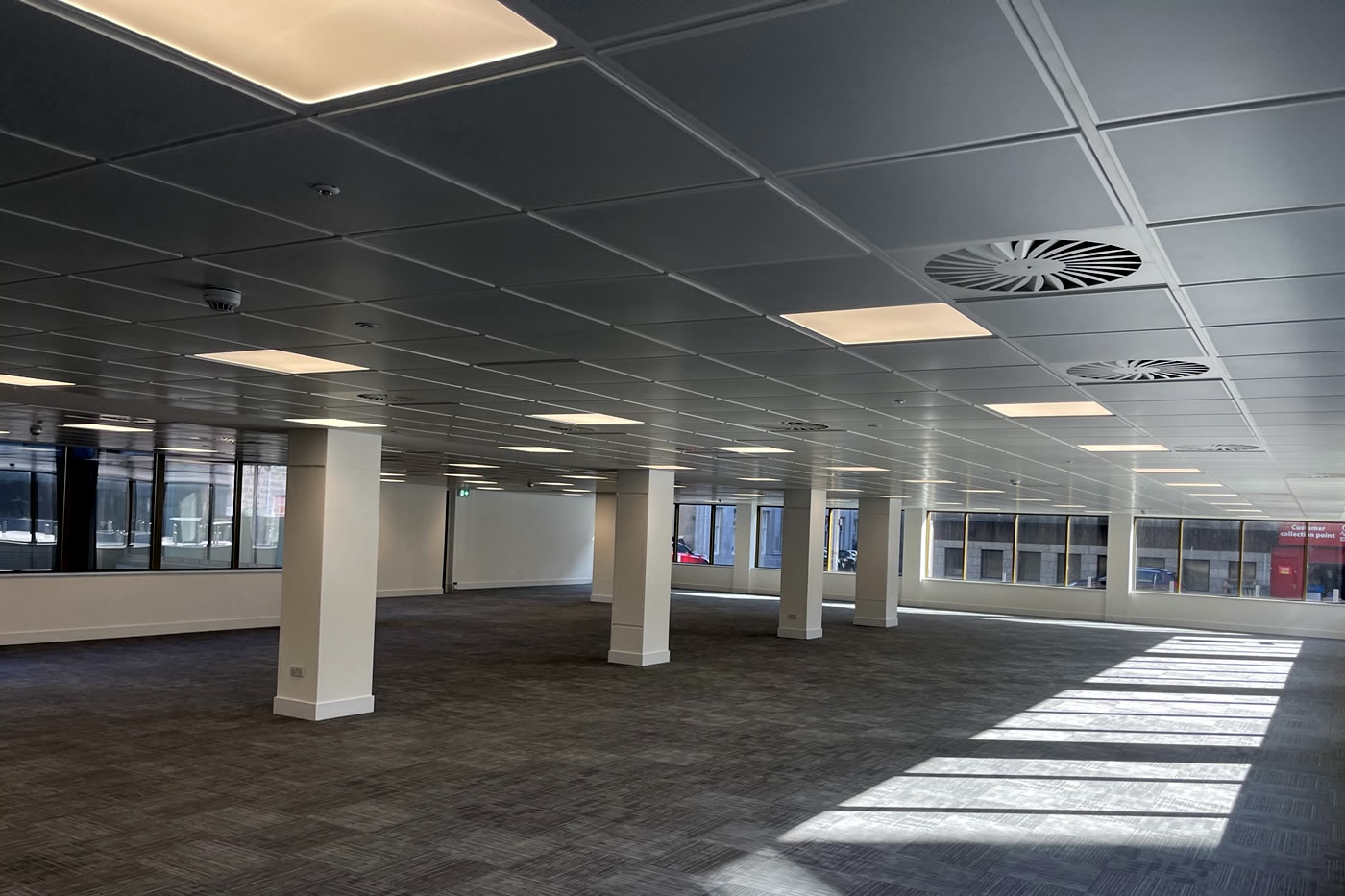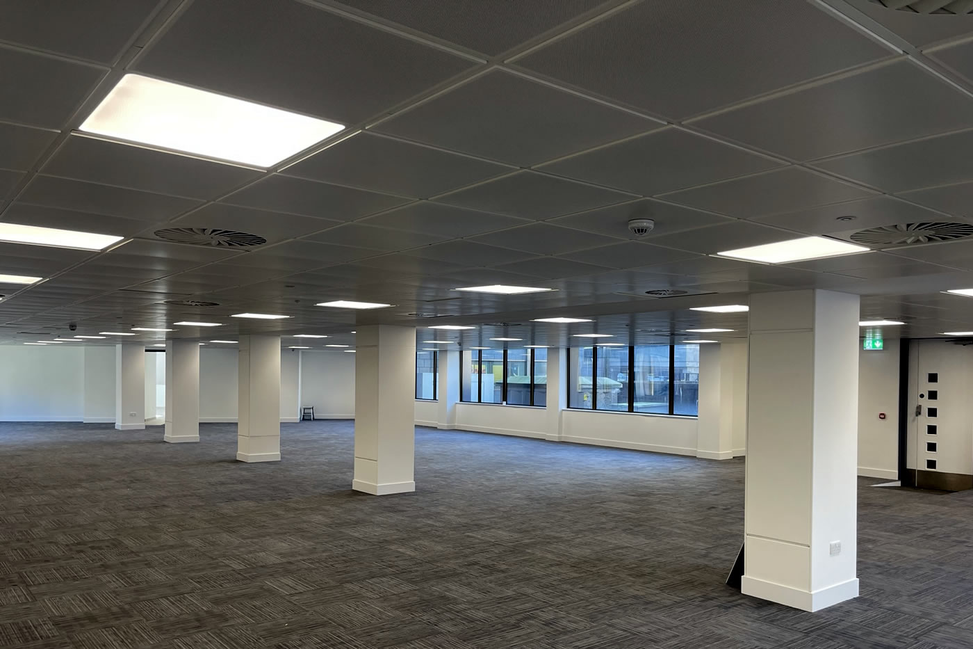Full internal strip out, design and installation of full mechanical and electrical installations, replacement aluminium windows, full reception refurbishment and installation of curtain wall entrance and revolving door, external paving and landscaping, raised access metal flooring, partitioning, suspended ceilings, decoration and floor finishes to a base build CAT A level.