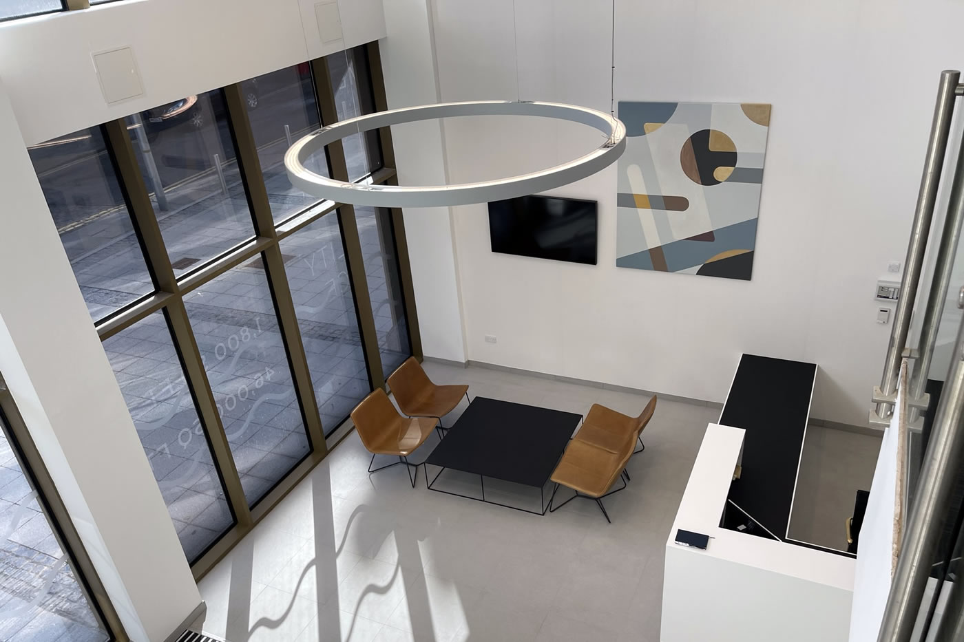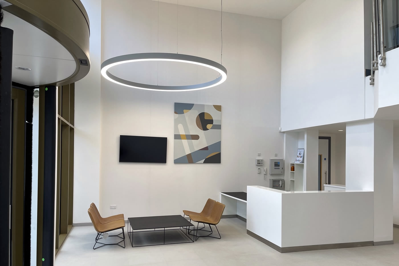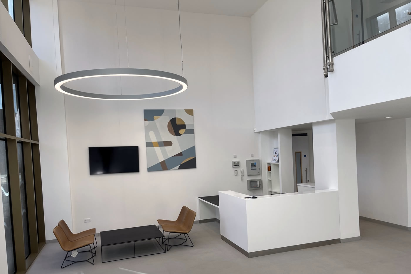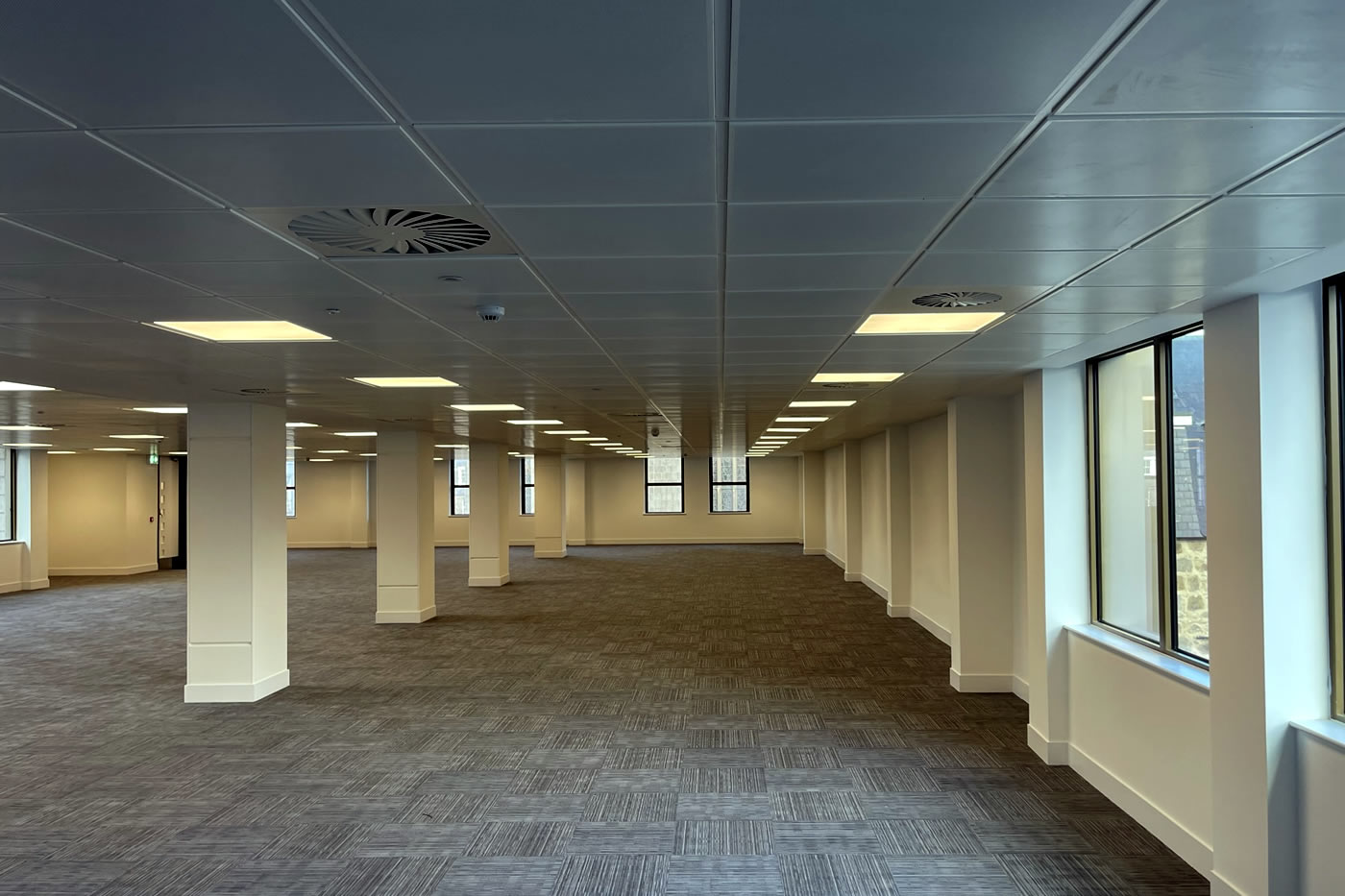 Full internal strip out, design and installation of full mechanical and electrical installations, replacement aluminium windows, full reception refurbishment and installation of curtain wall entrance and revolving door, external paving and landscaping, raised access metal flooring, partitioning, suspended ceilings, decoration and floor finishes to a base build CAT A level.