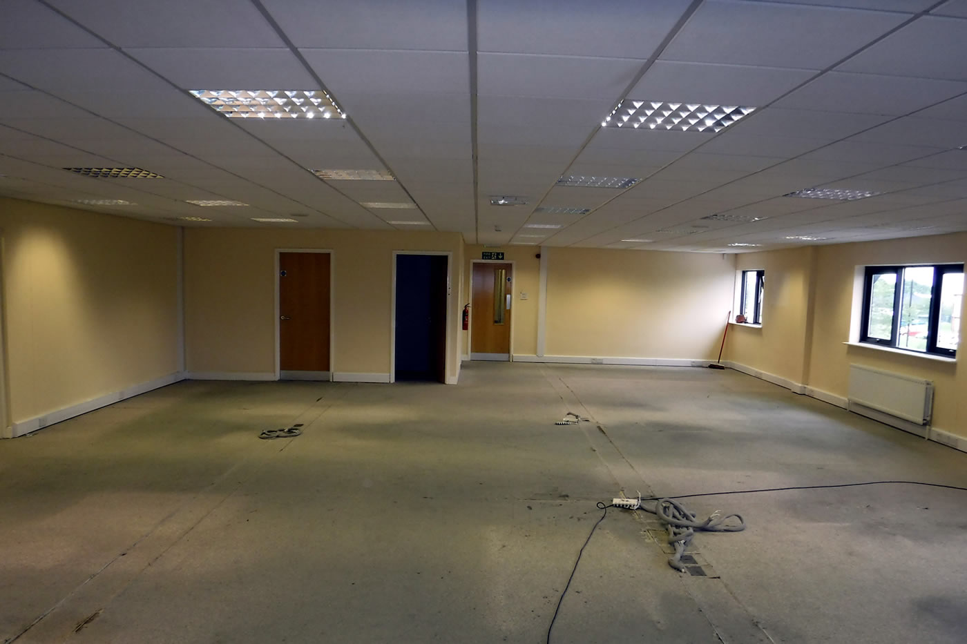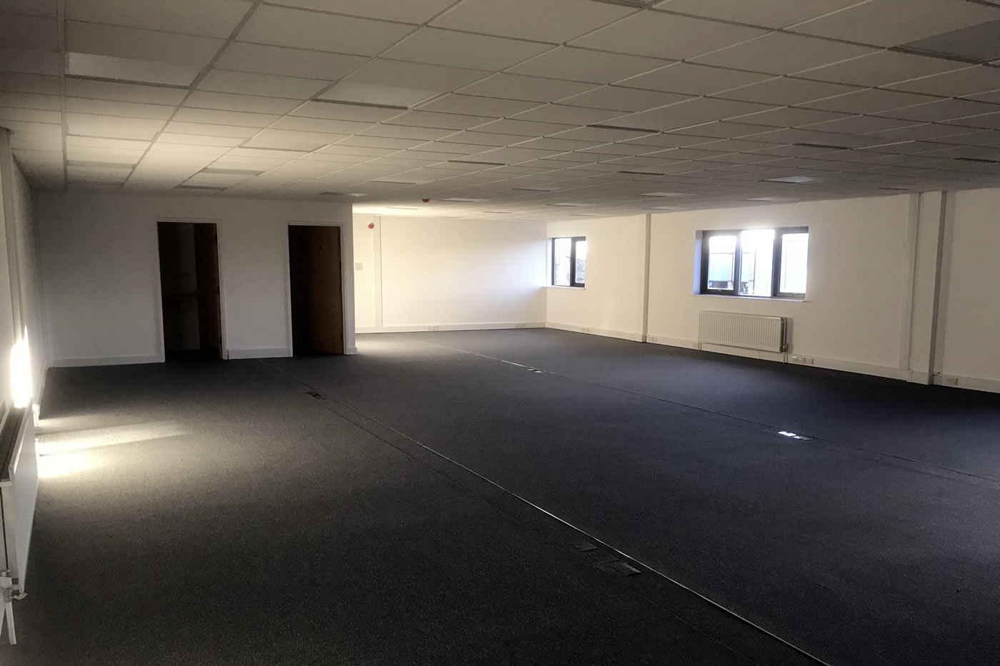 Strip out and refurbishment of large industrial unit and office block including envelope cleaning, window restoration, cut edge corrosion and gutter coating works, suspended ceiling and lighting, new boiler, plumbing and warehouse heating overhaul, decorations including epoxy floor coating, flooring and kitchens.