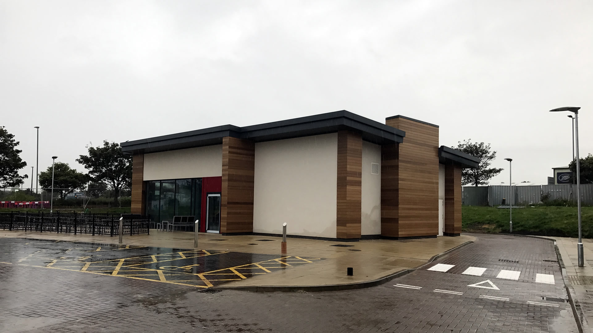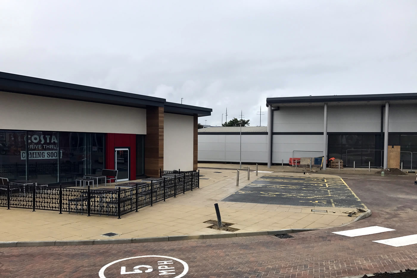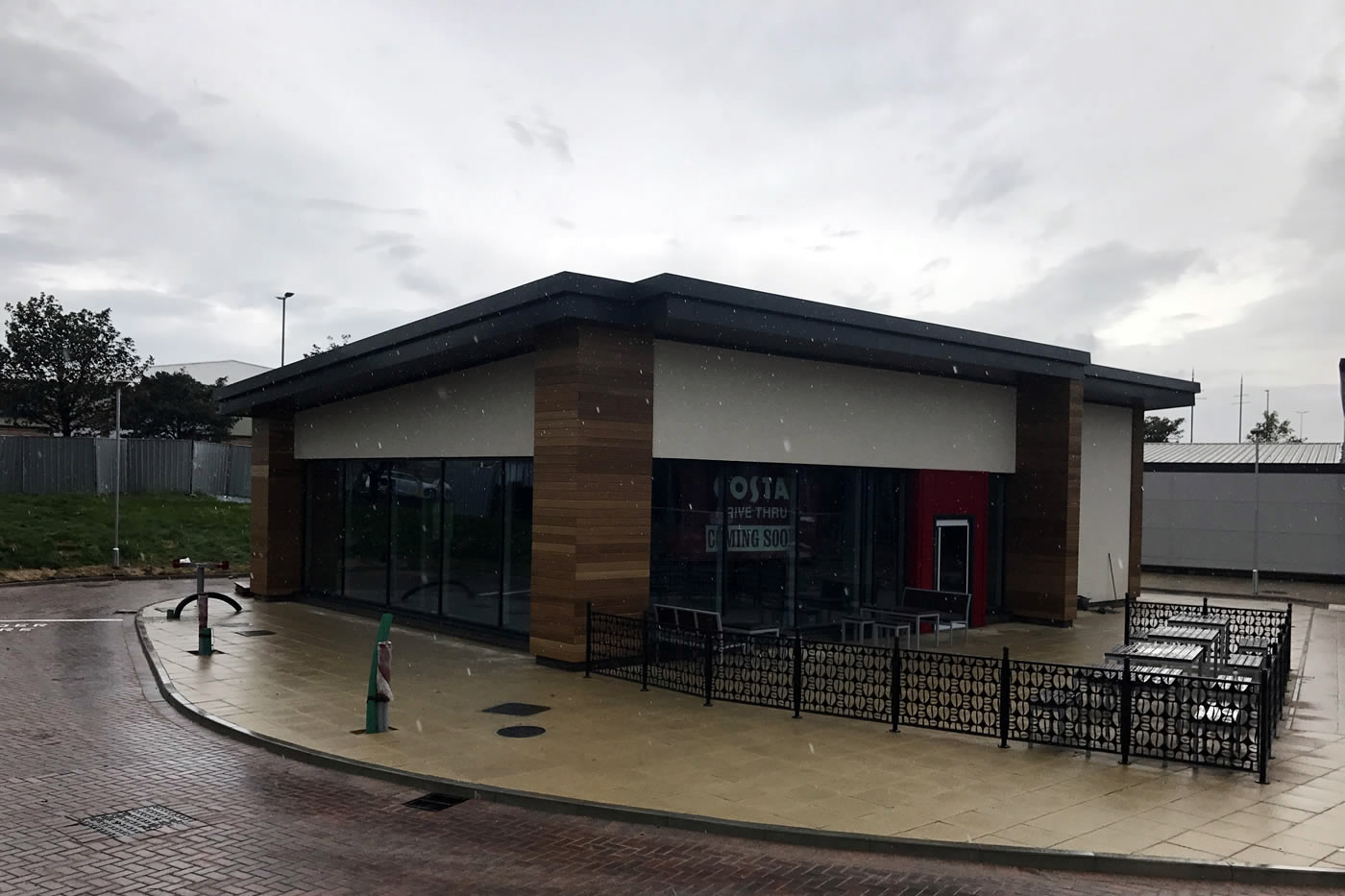 Design and construction of Costa Coffee Drive-Thru building to Shell including site strip of the existing surface to reduced levels, piled foundations, ground beams, suspended beam and block floor, external works including hardstanding area, Drive-Thru route, line marking, soft landscaping, external refuse storage areas, external lighting and associated services and drainage, connection to associated mains service supplies. Steel frame, masonry works, build up cladding roof system and gutters, single ply roofing to servery, through colour render, cedar cladding, aluminium windows and doors, steel fire exit door.