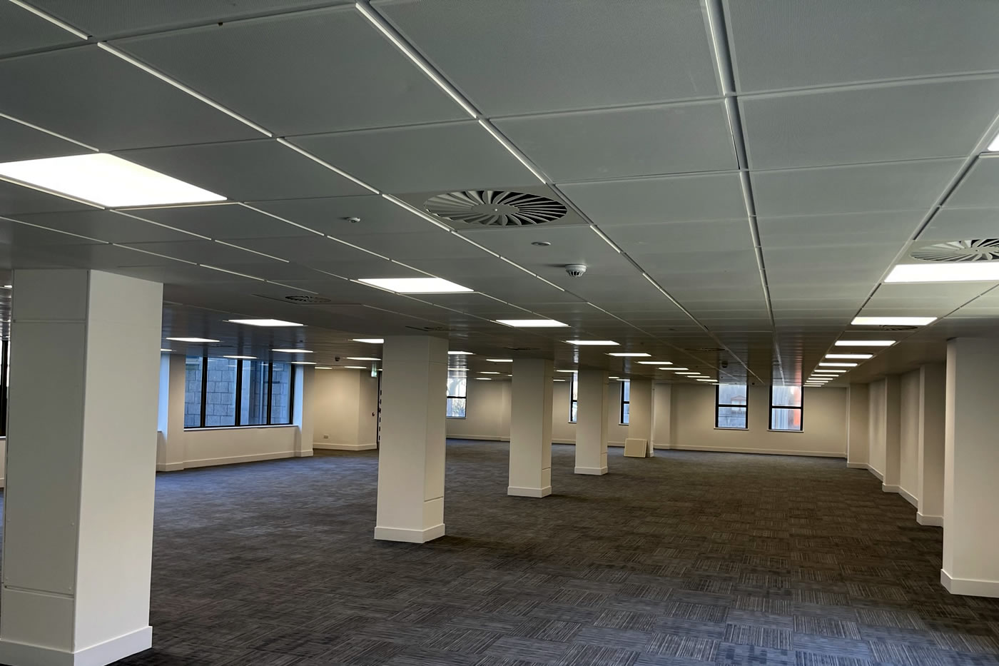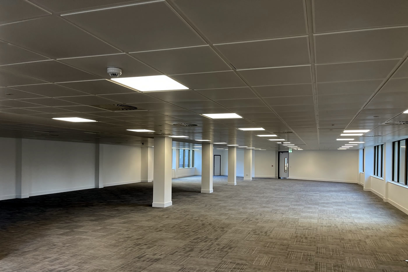 Full internal strip out, design and installation of full mechanical and electrical installations, replacement aluminium windows, full reception refurbishment and installation of curtain wall entrance and revolving door, external paving and landscaping, raised access metal flooring, partitioning, suspended ceilings, decoration and floor finishes to a base build CAT A level.