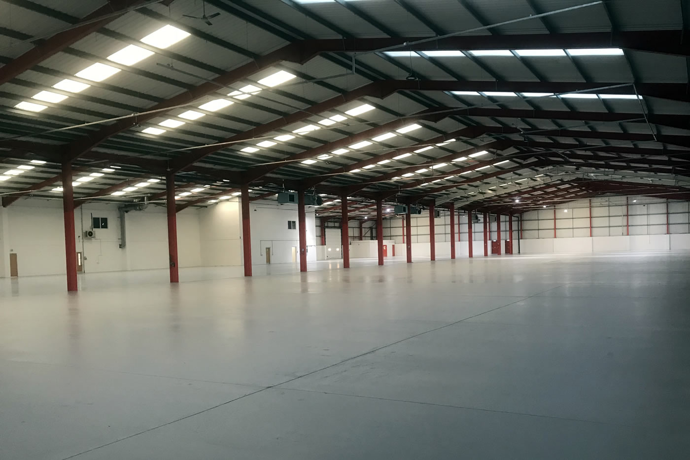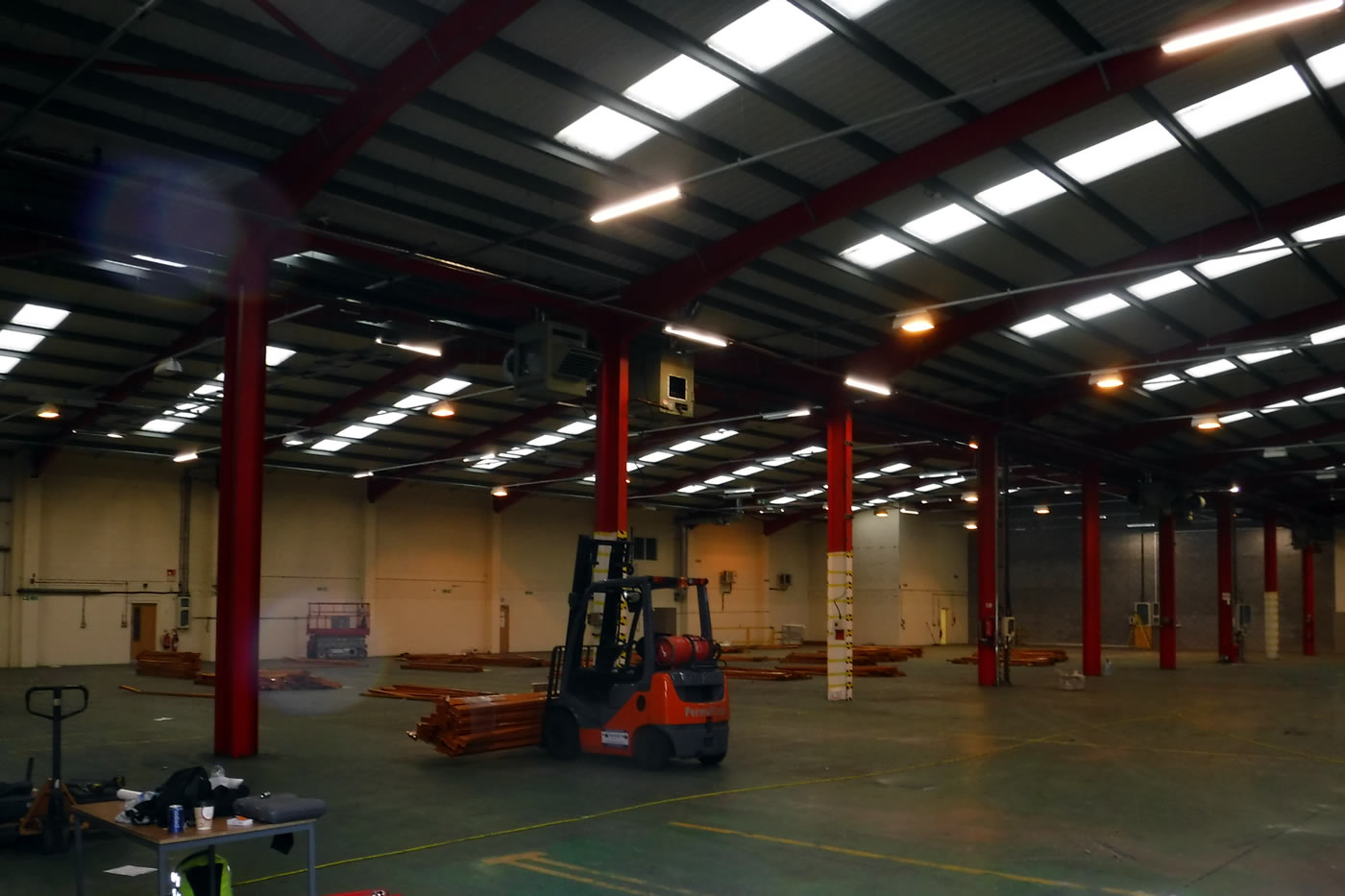 Strip out and refurbishment of large industrial unit and office block including envelope cleaning, window restoration, cut edge corrosion and gutter coating works, suspended ceiling and lighting, new boiler, plumbing and warehouse heating overhaul, decorations including epoxy floor coating, flooring and kitchens.